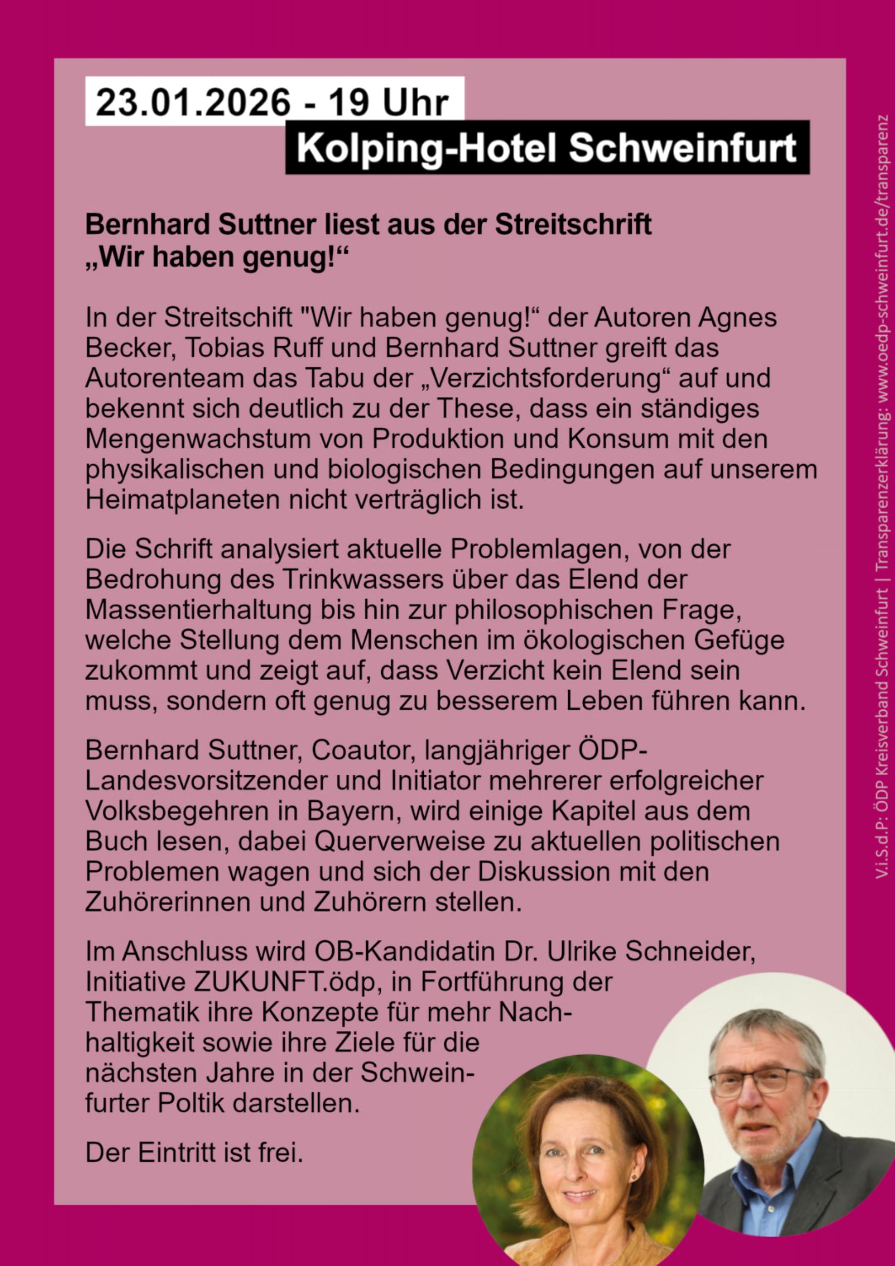 Bernhard Suttner, langjähriger ÖDP-Landesvorsitzender, Initiator mehrerer erfolgreicher Volksbegehren in Bayern und Coautor der Streitschrift, wird am 23.01.2026 um 19:00 Uhr im Kolping-Hotel in Schweinfurt unter dem Titel "Darf es auch etwas weniger sein...?" einige Kapitel aus dem Buch lesen, dabei Querverweise zu aktuellen (kommunal-)politischen Problemen wagen und sich der Diskussion mit den Zuhörerinnen und Zuhörern stellen.
