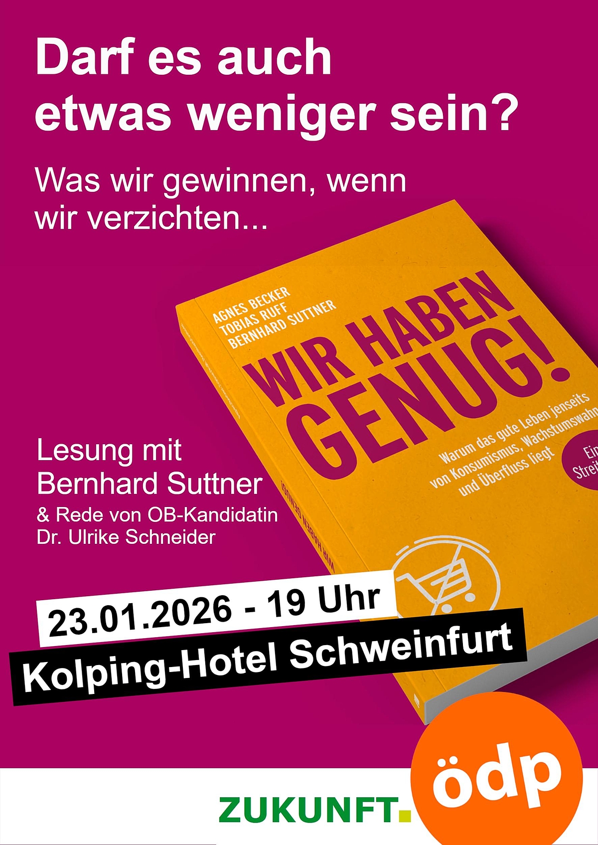 Auf Einladung der ÖDP Schweinfurt und der Initiative ZUKUNFT. wird Bernhard Suttner, langjähriger ÖDP-Landesvorsitzender, Initiator mehrerer erfolgreicher Volksbegehren in Bayern und aktueller Landesbeauftragter für Grundsatzfragen am 23.01.2026 um 19:00 Uhr im Kolping-Hotel in Schweinfurt unter dem Titel „Darf es auch etwas weniger sein…?“ einige Kapitel aus dem Buch lesen, dabei Querverweise zu aktuellen (kommunal-)politischen Problemen wagen und sich der Diskussion mit den Zuhörerinnen und Zuhörern stellen.